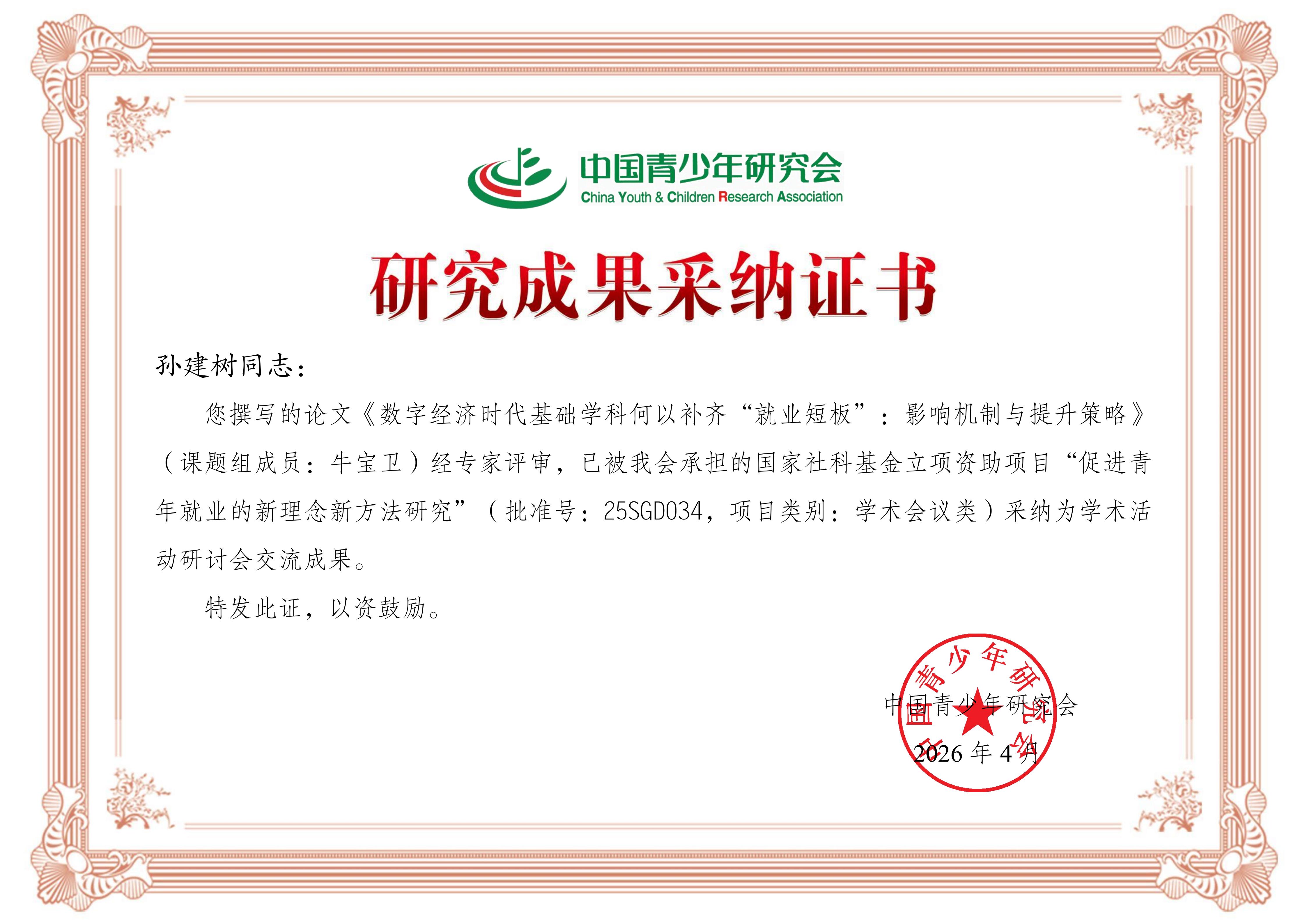 近日,中国青少年研究会发布“促进青年就业的新理念新方法研究系列学术活动成果征集入选公告”,孙建树、牛宝卫报送的《数字经济时代基础学科何以补齐“就业短板”:影响机制与提升策略》入选现场交流成果。