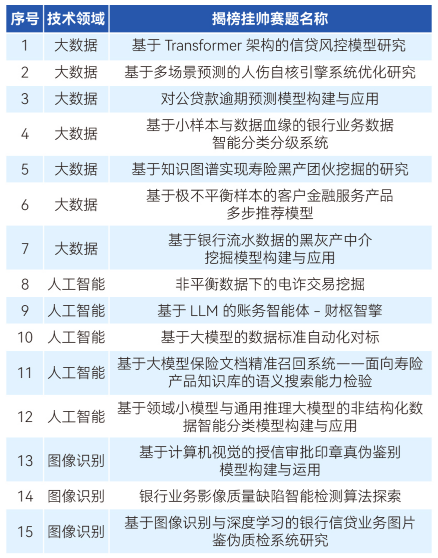 “揭榜挂帅”主赛道围绕大数据、人工智能与图像识别3大技术领域,共15个可供揭榜的赛题,赛题列表如下(具体赛题说明详见《附件2第四届中国研究生金融科技创新大赛“揭榜挂帅”赛道赛题指南》):