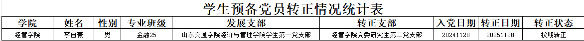 根据《中国共产党章程》和《中国共产党发展党员工作细则》及学校党委《关于发展学生党员工作的意见》(青科大党字〔2014〕77号)文件要求,必赢bwin线路检测中心研究生第二党支部于2025年12月2日召开预备党员转正大会讨论李自豪同志的转正问题,同意上述同志按期转为中共正式党员,现将其情况予以公示。公示期为2025年12月8日至2025年12月12日。如有异议,请于公示期内到必赢bwin线路检测中心党委反映。