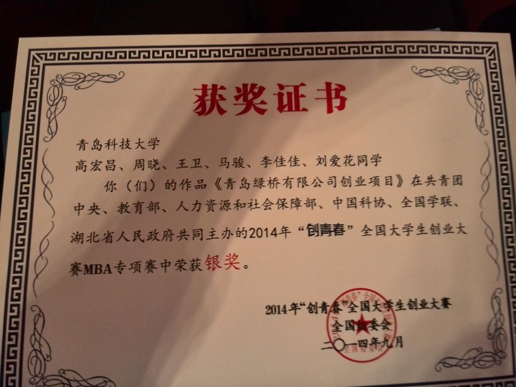 2014年9月26日,由共青团中央、教育部等多个部门共同主办的“创青春”全国大学生创业大赛首届MBA专项赛终审决赛在湖北襄阳市落下帷幕,我校MBA代表队推出的“青岛绿桥有限责任公司有机果蔬电子商务配送项目”经过多轮角逐,从全国237所高校中脱颖而出,喜获银奖,在山东省参赛高校中名列第二,这是我校开展MBA教育以来所获层次最高的创业大赛奖项。