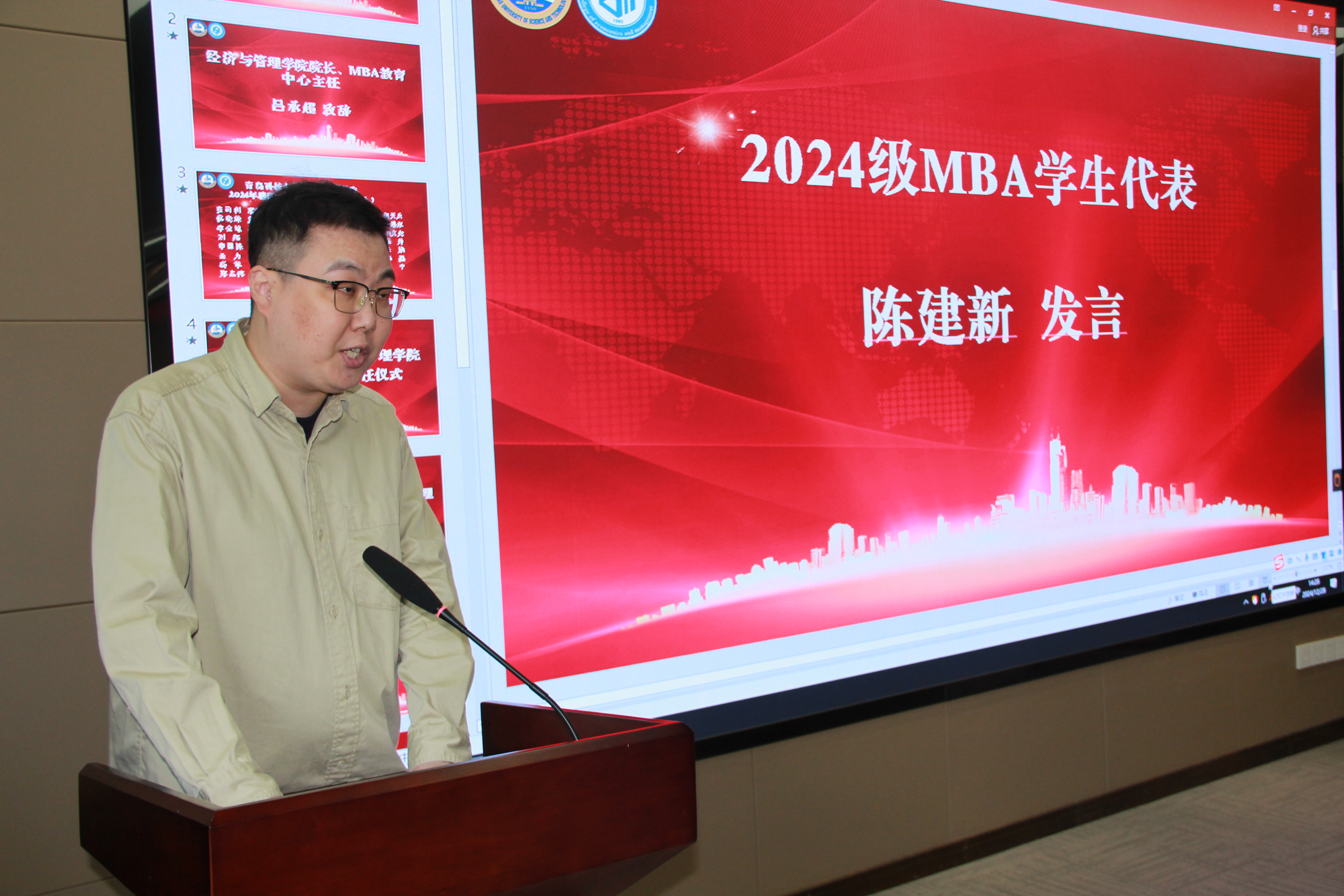 陈建新同学代表2024级MBA学生发言,表达了对校外导师的敬意与学习的热情。他表示,作为MBA学员将珍惜机会,虚心求教,跟着导师的指导,了解行业动态,将所学知识转化为解决实际问题的能力,以实际行动,展现新时代学子的风貌,不负导师们的期望。