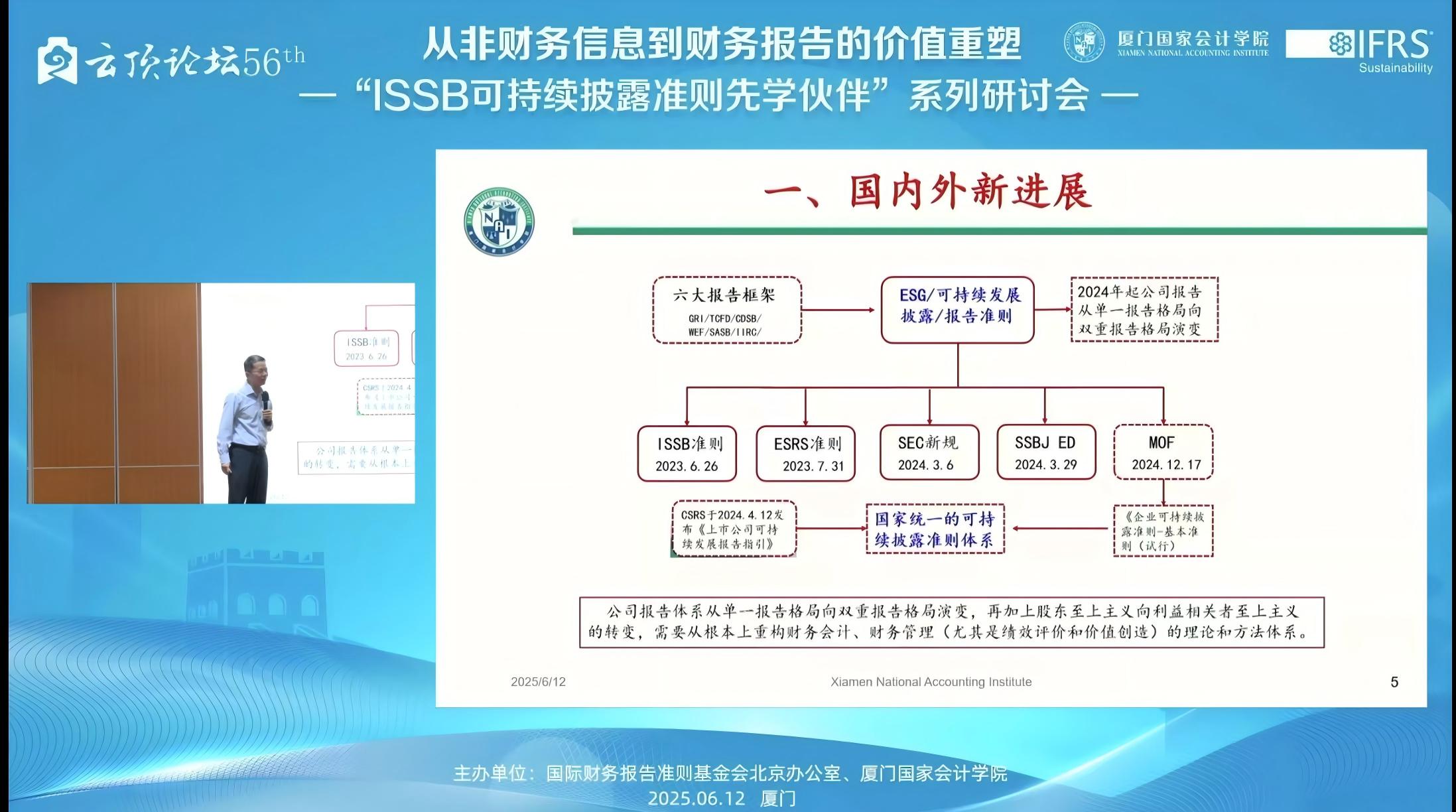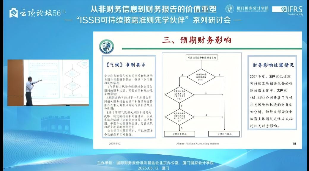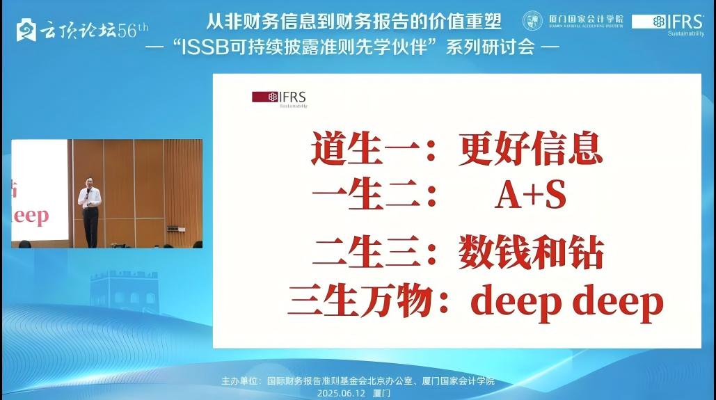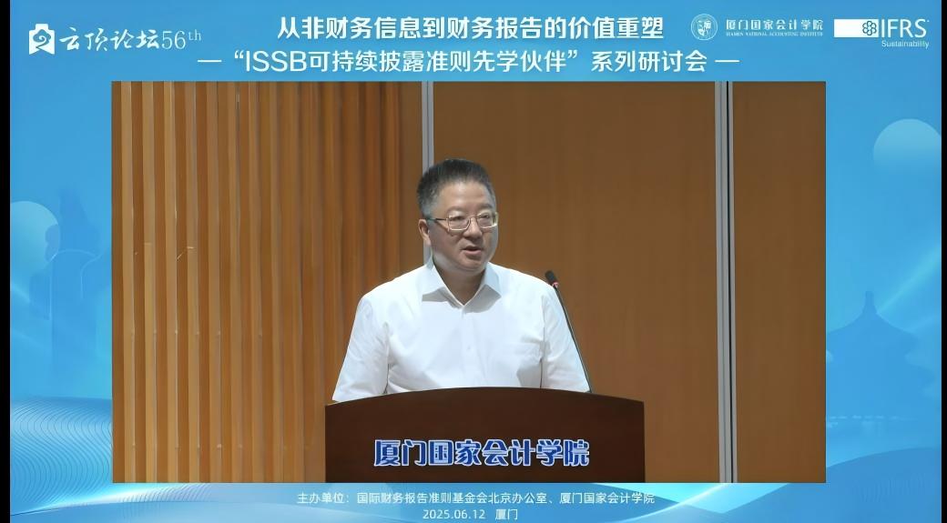 2025年6月12日,下午14:00——17:15,由国际财务报告准则基金会北京办公室与厦门国家会计学院主办的,第56届云顶论坛:从非财务信息到财务报告的价值重塑——“ISSB可持续披露准则先学伙伴”厦门研讨会在厦门国家会计学院学术报告厅B区顺利举办。同时,我校MPAcc学生也通过厦门国家会计学院微信公众号的直播同步参与了该学术讲座。