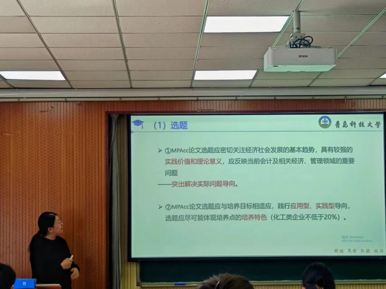 孙老师从毕业论文基本流程与要求、MPAcc毕业论文的基本要求、MPAcc毕业论文具体要点、MPAcc毕业论文格式规范四个方面进行讲解。首先讲述了毕业论文的基本流程,包括选题开题、论文的撰写、审查答辩修改、查重送审最终答辩等环节以及每部分具体的时间,使同学们对毕业论文有了初步了解。其次,讲述了毕业论文对选题的要求以及撰写过程中包括各部分细节的具体要求,使学生了解每部分应该如何正确撰写。再次,在具体要点方面,孙老师讲明了论文总体逻辑贯穿的重要性以及对摘要、绪论、概念理论机理、案例背景、案例分析、结论与建议、参考文献和致谢附录的具体撰写。最后,讲解了毕业论文的格式规范应参照学校研究生学位论文书写格式统一要求。