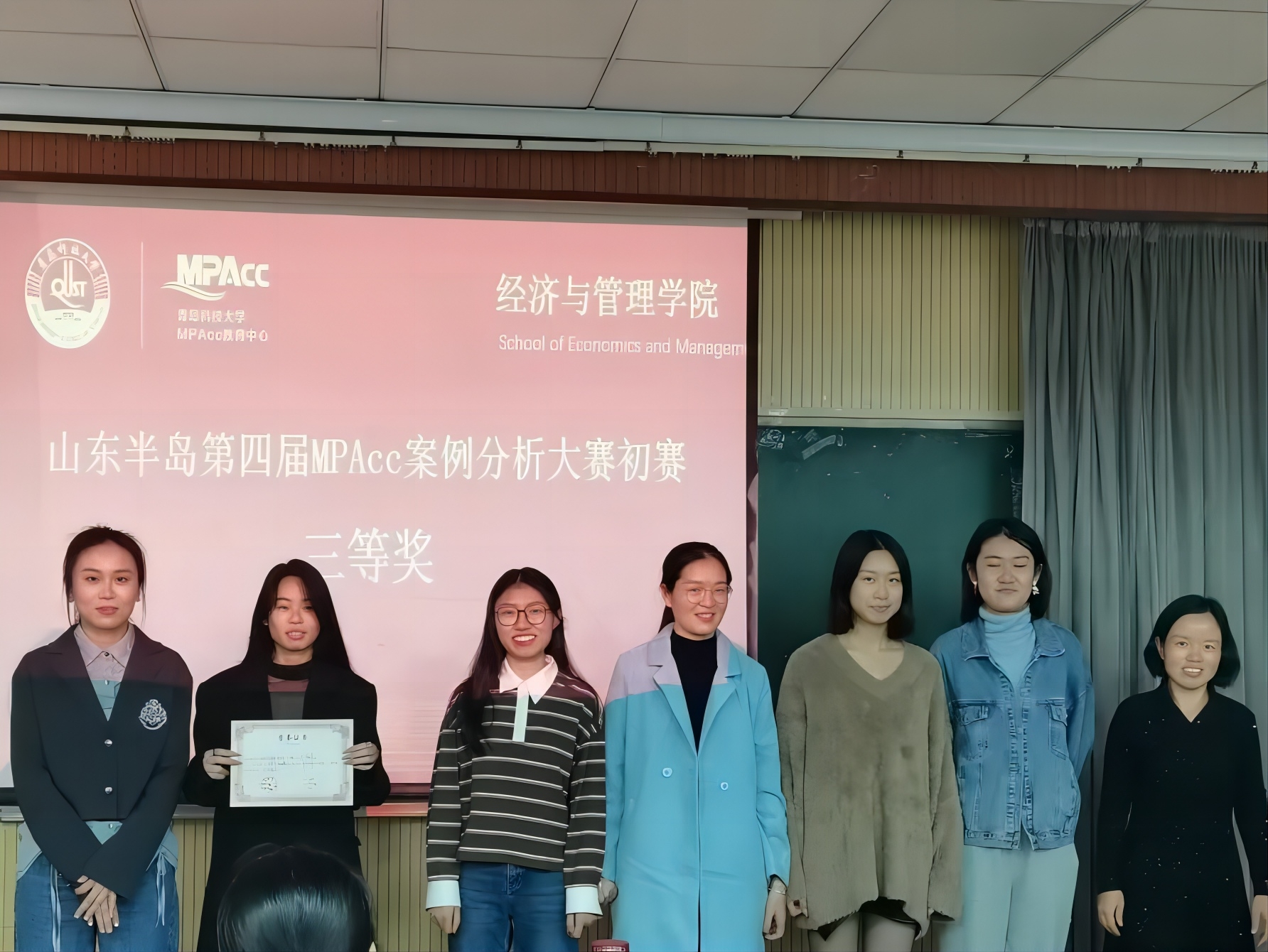 紧接着,由张玉老师、孙兰兰老师、张先敏老师为在山东半岛第四届MPAcc案例大赛初赛中获奖的队伍颁奖。