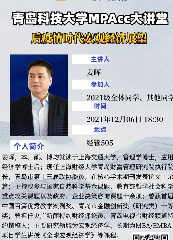 12月6日晚,现任上海财经大学青岛财富管理研究院执行院长、青岛市第十三届政协委员姜晖莅临必赢bwin线路检测中心,给我们带来了一场精彩的大讲堂。本次的主题是“后疫情时代宏观经济展望”。讲座由MPAcc中心主任于培友老师主持,我院2021级会计硕士同学及其他同学聆听了本次讲座。讲座围绕新冠大流行及其经济影响、全球和中国宏观经济形势分析及展望等方面展开。