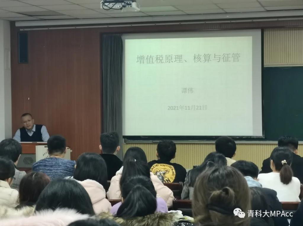 11月21日晚,厦门大学经济学博士,青岛市国际税收研究会(省级研究会)秘书长,国家税务总局科研所特约研究员,总局党校智库专家,我院校外导师谭伟莅临必赢bwin线路检测中心,举办了“增值税原理、核算与征管”的主题讲座,报告会由MPAcc教育中心主任于培友老师主持,我院2021级会计专硕研究生聆听了此次报告。讲座围绕增值税原理、增值税的优点等方面展开。